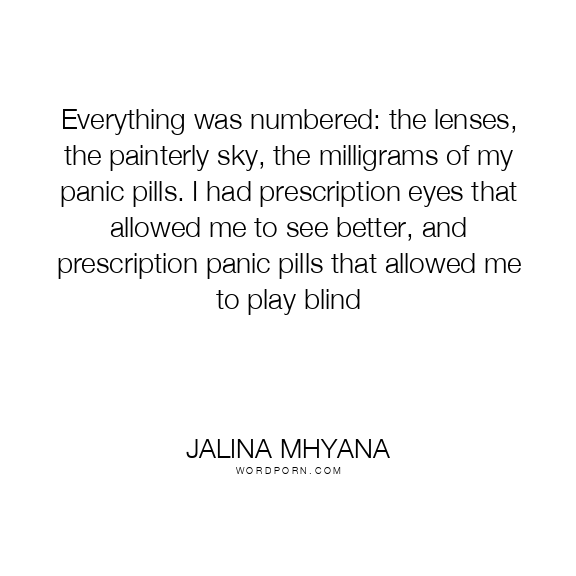 Everything was numbered: the lenses, the painterly sky, the milligrams of my panic pills. I had prescription eyes that allowed me to see better, and prescription panic pills that allowed me to play blind