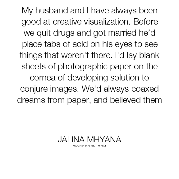 My husband and I have always been good at creative visualization. Before we quit drugs and got married he’d place tabs of acid on his eyes to see things that weren't there. I'd lay blank sheets of photographic paper on the cornea of developing solution to conjure images. We'd always coaxed dreams from paper, and believed them