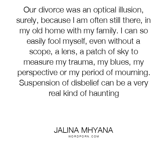 Our divorce was an optical illusion, surely, because I am often still there, in my old home with my family. I can so easily fool myself, even without a scope, a lens, a patch of sky to measure my trauma, my blues, my perspective or my period of mourning. Suspension of disbelief can be a very real kind of haunting