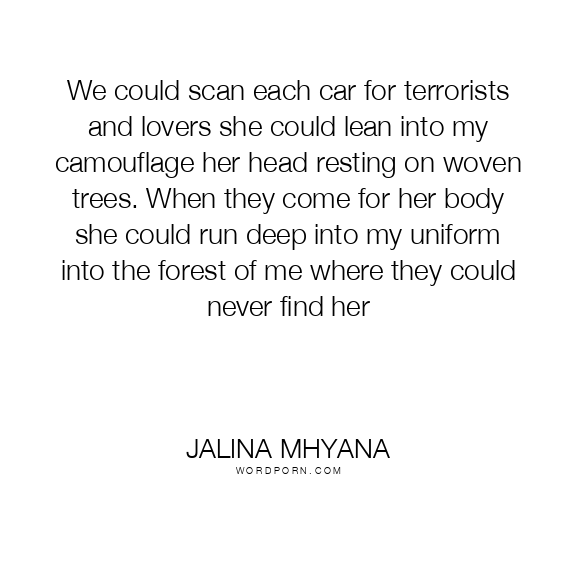 We could scan each car for terrorists and lovers she could lean into my camouflage her head resting on woven trees. When they come for her body she could run deep into my uniform into the forest of me where they could never find her