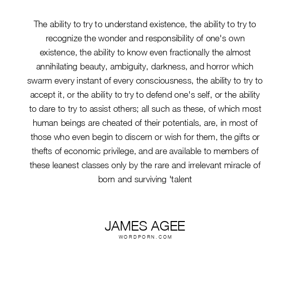 The ability to try to understand existence, the ability to try to recognize the wonder and responsibility of one's own existence, the ability to know even fractionally the almost annihilating beauty, ambiguity, darkness, and horror which swarm every instant of every consciousness, the ability to try to accept it, or the ability to try to defend one's self, or the ability to dare to try to assist others; all such as these, of which most human beings are cheated of their potentials, are, in most of those who even begin to discern or wish for them, the gifts or thefts of economic privilege, and are available to members of these leanest classes only by the rare and irrelevant miracle of born and surviving 'talent