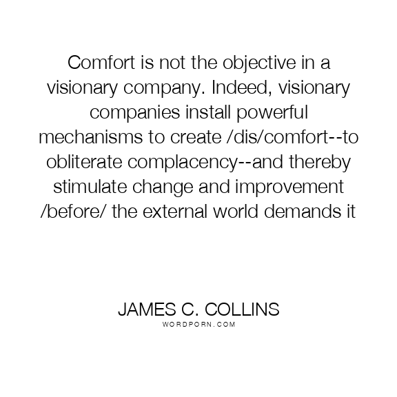 Comfort is not the objective in a visionary company. Indeed, visionary companies install powerful mechanisms to create /dis/comfort--to obliterate complacency--and thereby stimulate change and improvement /before/ the external world demands it