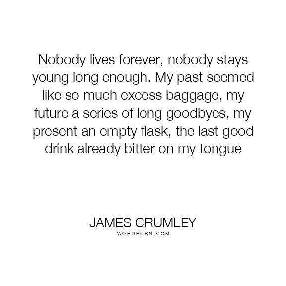 Nobody lives forever, nobody stays young long enough. My past seemed like so much excess baggage, my future a series of long goodbyes, my present an empty flask, the last good drink already bitter on my tongue