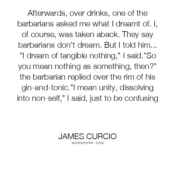 Afterwards, over drinks, one of the barbarians asked me what I dreamt of. I, of course, was taken aback. They say barbarians don't dream. But I told him... "I dream of tangible nothing," I said."So you mean nothing as something, then?" the barbarian replied over the rim of his gin-and-tonic."I mean unity, dissolving into non-self," I said, just to be confusing