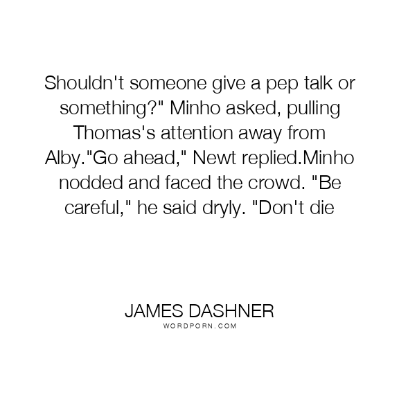 Shouldn't someone give a pep talk or something?" Minho asked, pulling Thomas's attention away from Alby."Go ahead," Newt replied.Minho nodded and faced the crowd. "Be careful," he said dryly. "Don't die