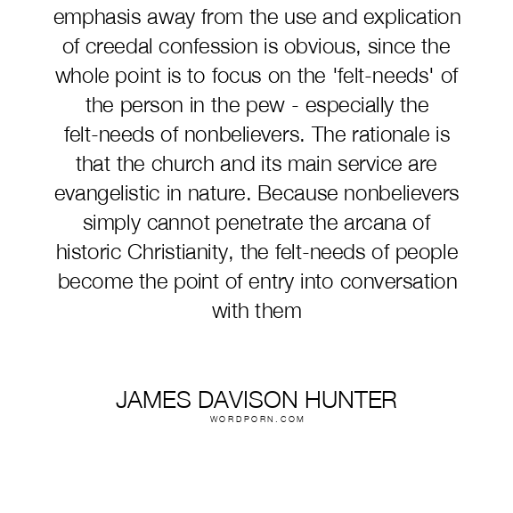 In the seeker-church movement the emphasis away from the use and explication of creedal confession is obvious, since the whole point is to focus on the 'felt-needs' of the person in the pew - especially the felt-needs of nonbelievers. The rationale is that the church and its main service are evangelistic in nature. Because nonbelievers simply cannot penetrate the arcana of historic Christianity, the felt-needs of people become the point of entry into conversation with them