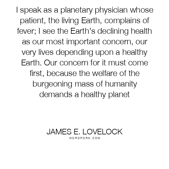 I speak as a planetary physician whose patient, the living Earth, complains of fever; I see the Earth's declining health as our most important concern, our very lives depending upon a healthy Earth. Our concern for it must come first, because the welfare of the burgeoning mass of humanity demands a healthy planet