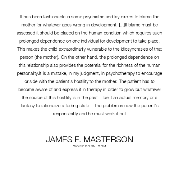 It has been fashionable in some psychiatric and lay circles to blame the mother for whatever goes wrong in development. [...]If blame must be assessed it should be placed on the human condition which requires such prolonged dependence on one individual for development to take place. This makes the child extraordinarily vulnerable to the idiosyncrasies of that person (the mother). On the other hand, the prolonged dependence on this relationship also provides the potential for the richness of the human personality.It is a mistake, in my judgment, in psychotherapy to encourage or side with the patient's hostility to the mother. The patient has to become aware of and express it in therapy in order to grow but whatever the source of this hostility is in the past -- be it an actual memory or a fantasy to rationalize a feeling state -- the problem is now the patient's responsibility and he must work it out