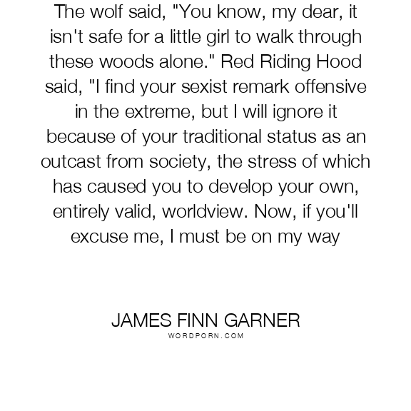 The wolf said, "You know, my dear, it isn't safe for a little girl to walk through these woods alone." Red Riding Hood said, "I find your sexist remark offensive in the extreme, but I will ignore it because of your traditional status as an outcast from society, the stress of which has caused you to develop your own, entirely valid, worldview. Now, if you'll excuse me, I must be on my way