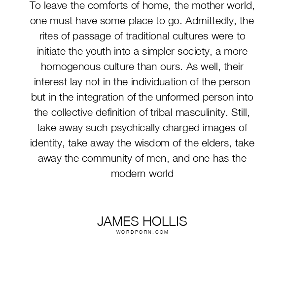 To leave the comforts of home, the mother world, one must have some place to go. Admittedly, the rites of passage of traditional cultures were to initiate the youth into a simpler society, a more homogenous culture than ours. As well, their interest lay not in the individuation of the person but in the integration of the unformed person into the collective definition of tribal masculinity. Still, take away such psychically charged images of identity, take away the wisdom of the elders, take away the community of men, and one has the modern world