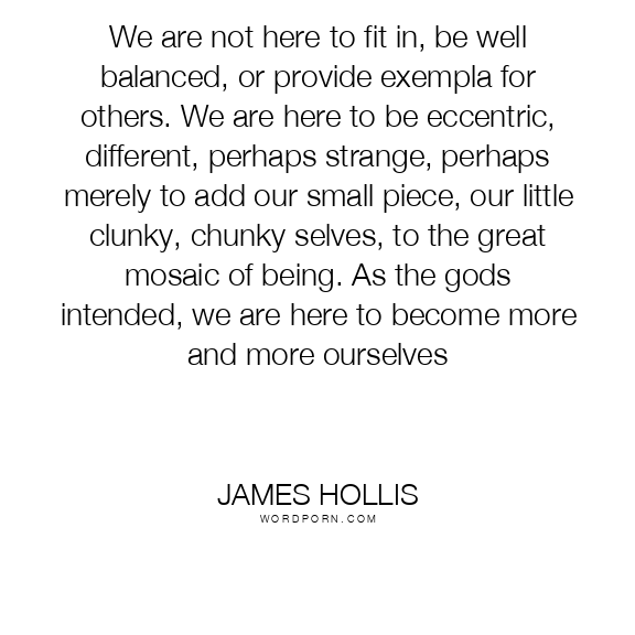 We are not here to fit in, be well balanced, or provide exempla for others. We are here to be eccentric, different, perhaps strange, perhaps merely to add our small piece, our little clunky, chunky selves, to the great mosaic of being. As the gods intended, we are here to become more and more ourselves