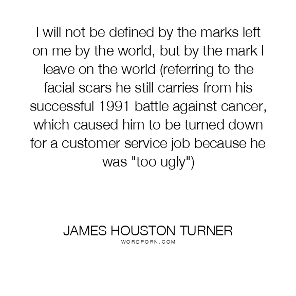 I will not be defined by the marks left on me by the world, but by the mark I leave on the world (referring to the facial scars he still carries from his successful 1991 battle against cancer, which caused him to be turned down for a customer service job because he was "too ugly")
