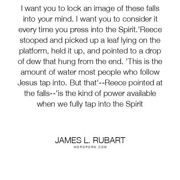 I want you to lock an image of these falls into your mind. I want you to consider it every time you press into the Spirit.'Reece stooped and picked up a leaf lying on the platform, held it up, and pointed to a drop of dew that hung from the end. 'This is the amount of water most people who follow Jesus tap into. But that'--Reece pointed at the falls--'is the kind of power available when we fully tap into the Spirit