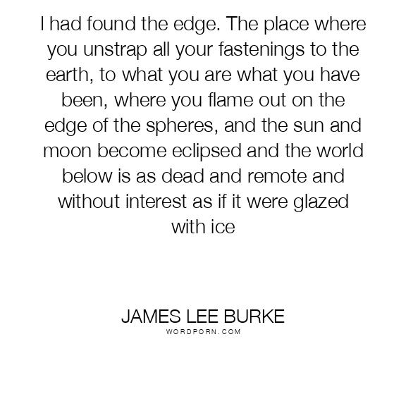 I had found the edge. The place where you unstrap all your fastenings to the earth, to what you are what you have been, where you flame out on the edge of the spheres, and the sun and moon become eclipsed and the world below is as dead and remote and without interest as if it were glazed with ice