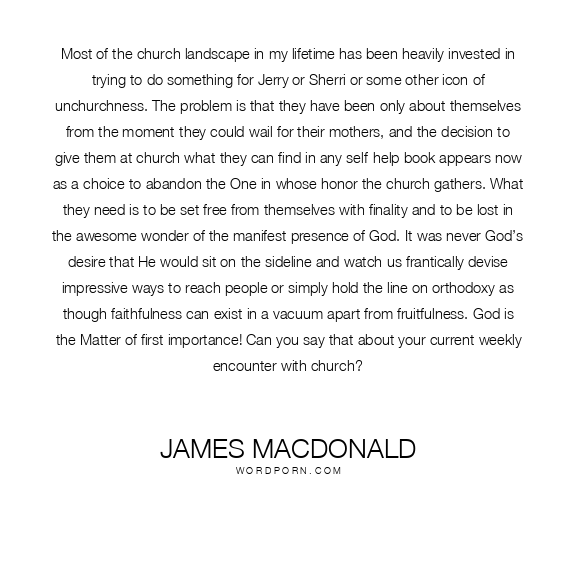 Most of the church landscape in my lifetime has been heavily invested in trying to do something for Jerry or Sherri or some other icon of unchurchness. The problem is that they have been only about themselves from the moment they could wail for their mothers, and the decision to give them at church what they can find in any self-help book appears now as a choice to abandon the One in whose honor the church gathers. What they need is to be set free from themselves with finality and to be lost in the awesome wonder of the manifest presence of God. It was never God’s desire that He would sit on the sideline and watch us frantically devise impressive ways to reach people or simply hold the line on orthodoxy as though faithfulness can exist in a vacuum apart from fruitfulness. God is the Matter of first importance! Can you say that about your current weekly encounter with church?