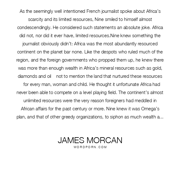 As the seemingly well-intentioned French journalist spoke about Africa’s scarcity and its limited resources, Nine smiled to himself almost condescendingly. He considered such statements an absolute joke. Africa did not, nor did it ever have, limited resources.Nine knew something the journalist obviously didn’t: Africa was the most abundantly resourced continent on the planet bar none. Like the despots who ruled much of the region, and the foreign governments who propped them up, he knew there was more than enough wealth in Africa’s mineral resources such as gold, diamonds and oil – not to mention the land that nurtured these resources – for every man, woman and child. He thought it unfortunate Africa had never been able to compete on a level playing field. The continent’s almost unlimited resources were the very reason foreigners had meddled in African affairs for the past century or more. Nine knew it was Omega’s plan, and that of other greedy organizations, to siphon as much wealth as they could out of vulnerable Third World countries, especially in Africa. The same organizations had the formula down pat: they indirectly started civil wars in mineral-rich regions by providing arms to opposing local factions, and sometimes even helped to create famines, in order to destabilize African countries. This made the targeted countries highly vulnerable to international control. Once the outside organizations had divided and conquered, they were then able to plunder the country’s resources
