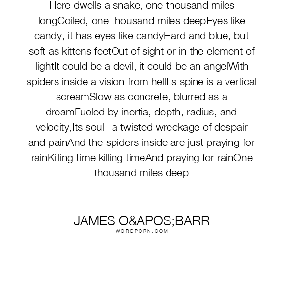 Here dwells a snake, one thousand miles longCoiled, one thousand miles deepEyes like candy, it has eyes like candyHard and blue, but soft as kittens feetOut of sight or in the element of lightIt could be a devil, it could be an angelWith spiders inside a vision from hellIts spine is a vertical screamSlow as concrete, blurred as a dreamFueled by inertia, depth, radius, and velocity,Its soul--a twisted wreckage of despair and painAnd the spiders inside are just praying for rainKilling time killing timeAnd praying for rainOne thousand miles deep