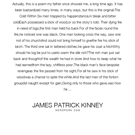 Actually, this is a poem my father once showed me, a long time ago. It has been bastardized many times, in many ways, but this is the original:The Cold Within Six men trapped by happenstance,in bleak and bitter coldEach possessed a stick of wood,or so the story's told. Their dying fire in need of logs,the first man held his back For of the faces round the fire,he noticed one was black. One man looking cross the way, saw one not of his churchAnd could not bring himself to givethe fire his stick of birch. The third one sat in tattered clothes,he gave his coat a hitchWhy should his log be put to useto warm the idle rich?The rich man just sat back and thoughtof the wealth he had in store And how to keep what he had earnedfrom the lazy, shiftless poor.The black man's face bespoke revengeas the fire passed from his sight,For all he saw in his stick of woodwas a chance to spite the white.And the last man of this forlorn groupdid naught except for gain,Giving only to those who gave,was how he played the gameThe logs held tight, in death's stillhands,was proof of human sinThey didn't die from the cold without,they died from the cold within