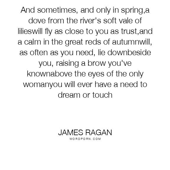 And sometimes, and only in spring,a dove from the river's soft vale of lilieswill fly as close to you as trust,and a calm in the great reds of autumnwill, as often as you need, lie downbeside you, raising a brow you've knownabove the eyes of the only womanyou will ever have a need to dream or touch