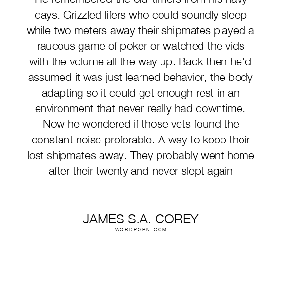He remembered the old-timers from his navy days. Grizzled lifers who could soundly sleep while two meters away their shipmates played a raucous game of poker or watched the vids with the volume all the way up. Back then he'd assumed it was just learned behavior, the body adapting so it could get enough rest in an environment that never really had downtime. Now he wondered if those vets found the constant noise preferable. A way to keep their lost shipmates away. They probably went home after their twenty and never slept again