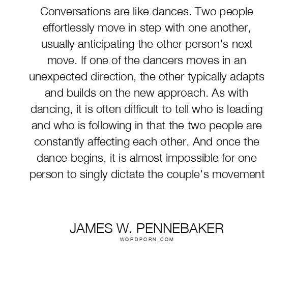 Conversations are like dances. Two people effortlessly move in step with one another, usually anticipating the other person's next move. If one of the dancers moves in an unexpected direction, the other typically adapts and builds on the new approach. As with dancing, it is often difficult to tell who is leading and who is following in that the two people are constantly affecting each other. And once the dance begins, it is almost impossible for one person to singly dictate the couple's movement