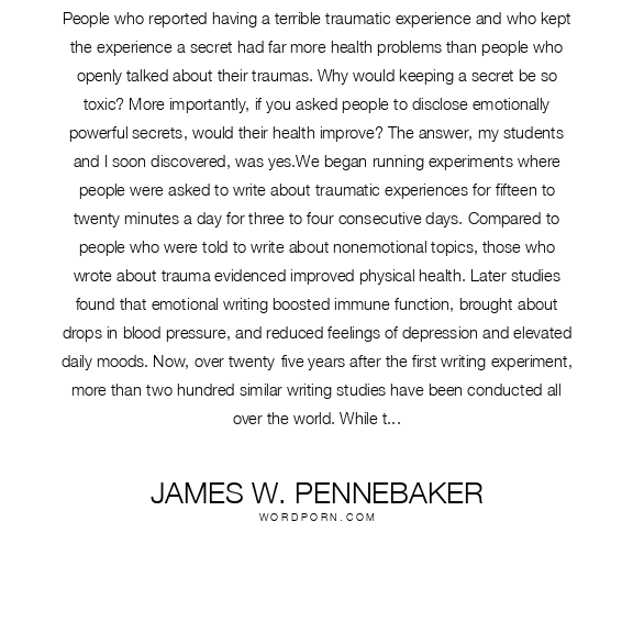 People who reported having a terrible traumatic experience and who kept the experience a secret had far more health problems than people who openly talked about their traumas. Why would keeping a secret be so toxic? More importantly, if you asked people to disclose emotionally powerful secrets, would their health improve? The answer, my students and I soon discovered, was yes.We began running experiments where people were asked to write about traumatic experiences for fifteen to twenty minutes a day for three to four consecutive days. Compared to people who were told to write about nonemotional topics, those who wrote about trauma evidenced improved physical health. Later studies found that emotional writing boosted immune function, brought about drops in blood pressure, and reduced feelings of depression and elevated daily moods. Now, over twenty-five years after the first writing experiment, more than two hundred similar writing studies have been conducted all over the world. While the effects are often modest, the mere act of translating emotional upheavals into words is consistently associated with improvements in physical and mental health