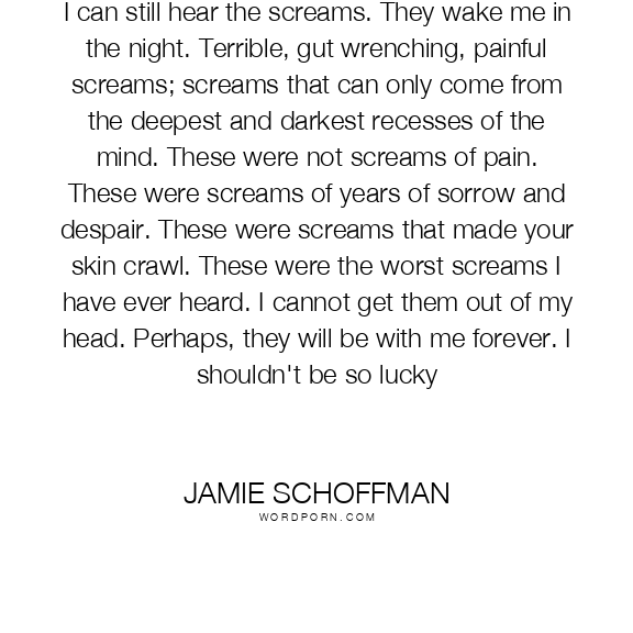 I can still hear the screams. They wake me in the night. Terrible, gut wrenching, painful screams; screams that can only come from the deepest and darkest recesses of the mind. These were not screams of pain. These were screams of years of sorrow and despair. These were screams that made your skin crawl. These were the worst screams I have ever heard. I cannot get them out of my head. Perhaps, they will be with me forever. I shouldn't be so lucky