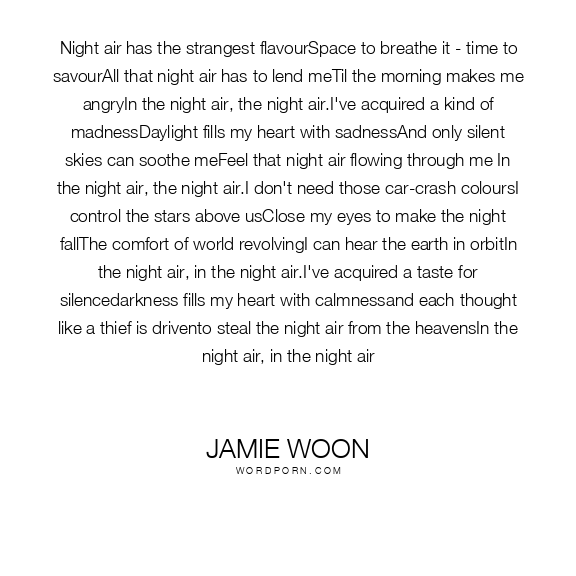 Night air has the strangest flavourSpace to breathe it - time to savourAll that night air has to lend meTil the morning makes me angryIn the night air, the night air.I've acquired a kind of madnessDaylight fills my heart with sadnessAnd only silent skies can soothe meFeel that night air flowing through me In the night air, the night air.I don't need those car-crash coloursI control the stars above usClose my eyes to make the night fallThe comfort of world revolvingI can hear the earth in orbitIn the night air, in the night air.I've acquired a taste for silencedarkness fills my heart with calmnessand each thought like a thief is drivento steal the night air from the heavensIn the night air, in the night air