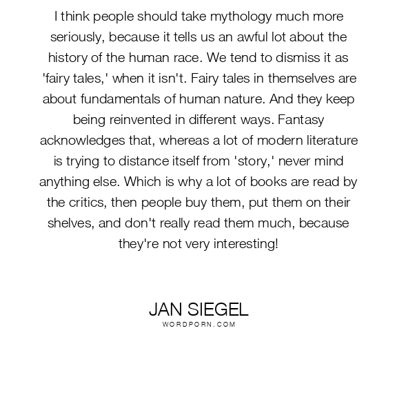I think people should take mythology much more seriously, because it tells us an awful lot about the history of the human race. We tend to dismiss it as 'fairy tales,' when it isn't. Fairy tales in themselves are about fundamentals of human nature. And they keep being reinvented in different ways. Fantasy acknowledges that, whereas a lot of modern literature is trying to distance itself from 'story,' never mind anything else. Which is why a lot of books are read by the critics, then people buy them, put them on their shelves, and don't really read them much, because they're not very interesting!