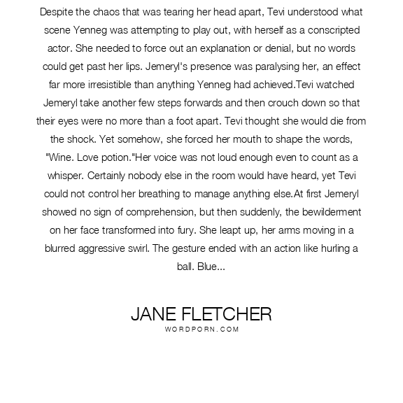 Despite the chaos that was tearing her head apart, Tevi understood what scene Yenneg was attempting to play out, with herself as a conscripted actor. She needed to force out an explanation or denial, but no words could get past her lips. Jemeryl's presence was paralysing her, an effect far more irresistible than anything Yenneg had achieved.Tevi watched Jemeryl take another few steps forwards and then crouch down so that their eyes were no more than a foot apart. Tevi thought she would die from the shock. Yet somehow, she forced her mouth to shape the words, "Wine. Love potion."Her voice was not loud enough even to count as a whisper. Certainly nobody else in the room would have heard, yet Tevi could not control her breathing to manage anything else.At first Jemeryl showed no sign of comprehension, but then suddenly, the bewilderment on her face transformed into fury. She leapt up, her arms moving in a blurred aggressive swirl. The gesture ended with an action like hurling a ball. Blue fire erupted from Jemeryl's hands and shot towards Yenneg.The other sorcerer had obviously recognised the gesture and made an effort to protect himself. A shimmering shield sprung up before Yenneg, but it was not strong enough, and the shockwave knocked him off his feet. His shoulders slammed into the wall behind him and he crumpled to the floor. Jemeryl had been telling the truth when she claimed to vastly excel the acolytes in magical ability, not that Tevi had ever entertained doubts. Jemeryl's hands moved again, and this time Yenneg was sprawled on the floor and in no state to mount a defence. A second bolt of blue fire burst in his direction.Lightning in the form of a whip snapped across the room, intercepting Jemeryl's attack before it struck. The diverted fireball hit the wall of the summerhouse two feet from Yenneg's head and smashed through it, as if it were a stone going through wet paper