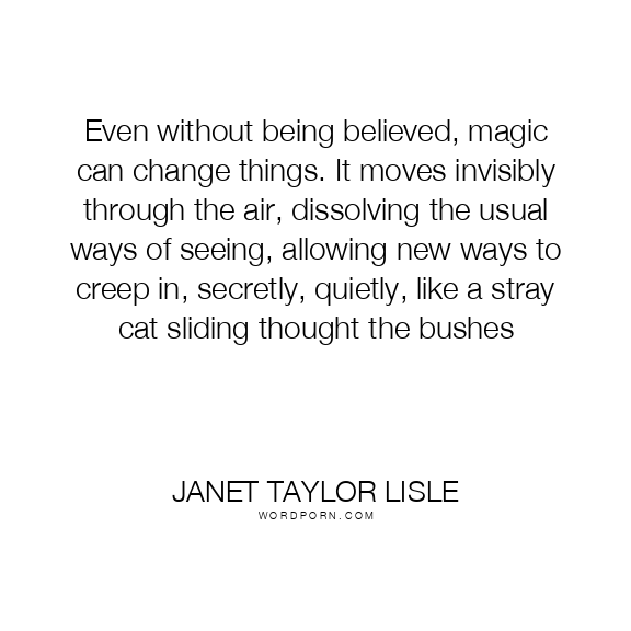 Even without being believed, magic can change things. It moves invisibly through the air, dissolving the usual ways of seeing, allowing new ways to creep in, secretly, quietly, like a stray cat sliding thought the bushes