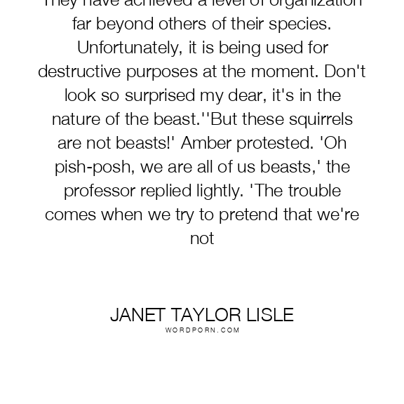 They have achieved a level of organization far beyond others of their species. Unfortunately, it is being used for destructive purposes at the moment. Don't look so surprised my dear, it's in the nature of the beast.''But these squirrels are not beasts!' Amber protested. 'Oh pish-posh, we are all of us beasts,' the professor replied lightly. 'The trouble comes when we try to pretend that we're not