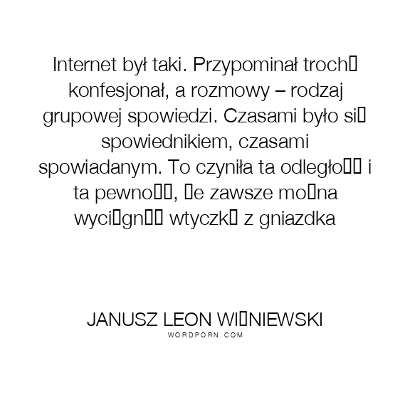 Internet był taki. Przypominał trochę konfesjonał, a rozmowy – rodzaj grupowej spowiedzi. Czasami było się spowiednikiem, czasami spowiadanym. To czyniła ta odległość i ta pewność, że zawsze można wyciągnąć wtyczkę z gniazdka