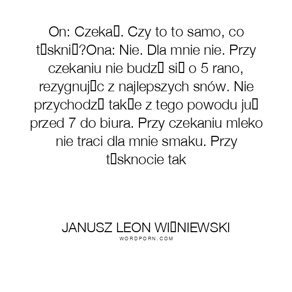 On: Czekać. Czy to to samo, co tęsknić?Ona: Nie. Dla mnie nie. Przy czekaniu nie budzę się o 5 rano, rezygnując z najlepszych snów. Nie przychodzę także z tego powodu już przed 7 do biura. Przy czekaniu mleko nie traci dla mnie smaku. Przy tęsknocie tak