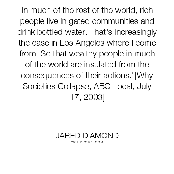 In much of the rest of the world, rich people live in gated communities and drink bottled water. That's increasingly the case in Los Angeles where I come from. So that wealthy people in much of the world are insulated from the consequences of their actions."[Why Societies Collapse, ABC Local, July 17, 2003]