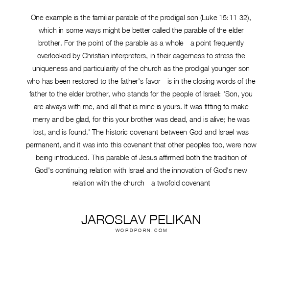 One example is the familiar parable of the prodigal son (Luke 15:11-32), which in some ways might be better called the parable of the elder brother. For the point of the parable as a whole - a point frequently overlooked by Christian interpreters, in their eagerness to stress the uniqueness and particularity of the church as the prodigal younger son who has been restored to the father's favor - is in the closing words of the father to the elder brother, who stands for the people of Israel: 'Son, you are always with me, and all that is mine is yours. It was fitting to make merry and be glad, for this your brother was dead, and is alive; he was lost, and is found.' The historic covenant between God and Israel was permanent, and it was into this covenant that other peoples too, were now being introduced. This parable of Jesus affirmed both the tradition of God's continuing relation with Israel and the innovation of God's new relation with the church - a twofold covenant