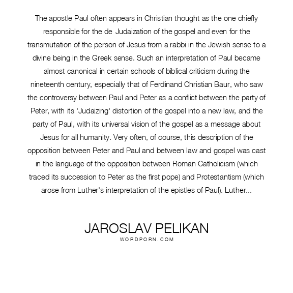 The apostle Paul often appears in Christian thought as the one chiefly responsible for the de-Judaization of the gospel and even for the transmutation of the person of Jesus from a rabbi in the Jewish sense to a divine being in the Greek sense. Such an interpretation of Paul became almost canonical in certain schools of biblical criticism during the nineteenth century, especially that of Ferdinand Christian Baur, who saw the controversy between Paul and Peter as a conflict between the party of Peter, with its 'Judaizing' distortion of the gospel into a new law, and the party of Paul, with its universal vision of the gospel as a message about Jesus for all humanity. Very often, of course, this description of the opposition between Peter and Paul and between law and gospel was cast in the language of the opposition between Roman Catholicism (which traced its succession to Peter as the first pope) and Protestantism (which arose from Luther's interpretation of the epistles of Paul). Luther's favorite among those epistles, the letter to the Romans, became the charter for this supposed declaration of independence from Judaism