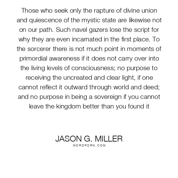 Those who seek only the rapture of divine union and quiescence of the mystic state are likewise not on our path. Such navel gazers lose the script for why they are even incarnated in the first place. To the sorcerer there is not much point in moments of primordial awareness if it does not carry over into the living levels of consciousness; no purpose to receiving the uncreated and clear light, if one cannot reflect it outward through world and deed; and no purpose in being a sovereign if you cannot leave the kingdom better than you found it