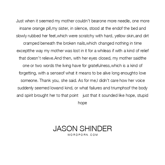 Just when it seemed my mother couldn’t bearone more needle, one more insane orange pill,my sister, in silence, stood at the endof the bed and slowly rubbed her feet,which were scratchy with hard, yellow skin,and dirt cramped beneath the broken nails,which changed nothing in time exceptthe way my mother was lost in it for a whileas if with a kind of relief that doesn’t relieve.And then, with her eyes closed, my mother saidthe one or two words the living have for gratefulness,which is a kind of forgetting, with a senseof what it means to be alive long enoughto love someone. Thank you, she said. As for me,I didn’t care how her voice suddenly seemed lowand kind, or what failures and triumphsof the body and spirit brought her to that point—just that it sounded like hope, stupid hope