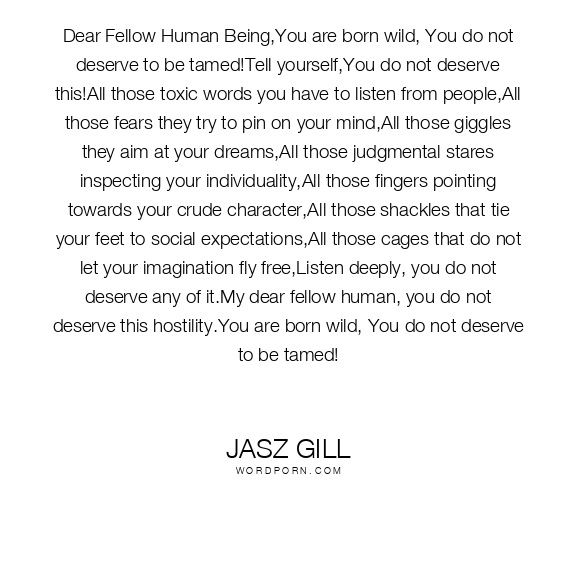 Dear Fellow Human Being,You are born wild, You do not deserve to be tamed!Tell yourself,You do not deserve this!All those toxic words you have to listen from people,All those fears they try to pin on your mind,All those giggles they aim at your dreams,All those judgmental stares inspecting your individuality,All those fingers pointing towards your crude character,All those shackles that tie your feet to social expectations,All those cages that do not let your imagination fly free,Listen deeply, you do not deserve any of it.My dear fellow human, you do not deserve this hostility.You are born wild, You do not deserve to be tamed!― Jasz Gill
