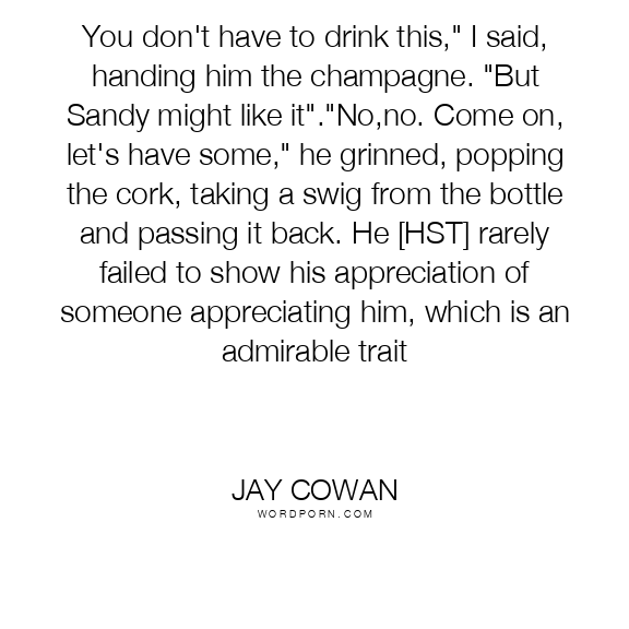 You don't have to drink this," I said, handing him the champagne. "But Sandy might like it"."No,no. Come on, let's have some," he grinned, popping the cork, taking a swig from the bottle and passing it back. He [HST] rarely failed to show his appreciation of someone appreciating him, which is an admirable trait