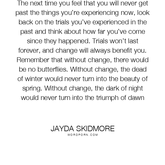 The next time you feel that you will never get past the things you’re experiencing now, look back on the trials you’ve experienced in the past and think about how far you’ve come since they happened. Trials won’t last forever, and change will always benefit you. Remember that without change, there would be no butterflies. Without change, the dead of winter would never turn into the beauty of spring. Without change, the dark of night would never turn into the triumph of dawn