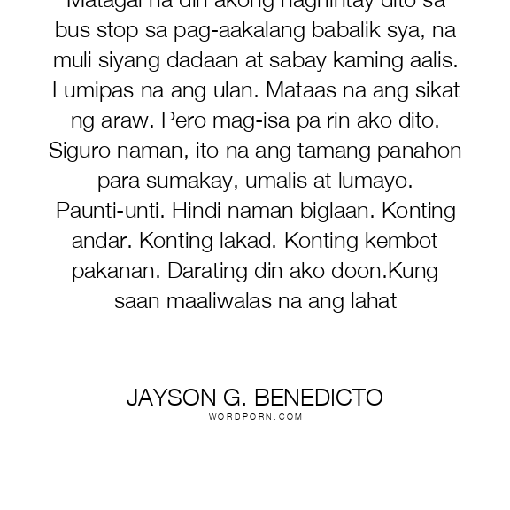 Matagal na din akong naghintay dito sa bus stop sa pag-aakalang babalik sya, na muli siyang dadaan at sabay kaming aalis. Lumipas na ang ulan. Mataas na ang sikat ng araw. Pero mag-isa pa rin ako dito. Siguro naman, ito na ang tamang panahon para sumakay, umalis at lumayo. Paunti-unti. Hindi naman biglaan. Konting andar. Konting lakad. Konting kembot pakanan. Darating din ako doon.Kung saan maaliwalas na ang lahat