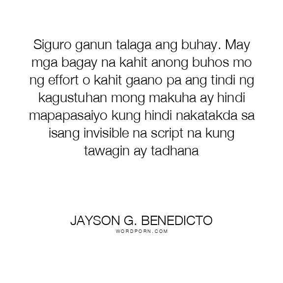 Siguro ganun talaga ang buhay. May mga bagay na kahit anong buhos mo ng effort o kahit gaano pa ang tindi ng kagustuhan mong makuha ay hindi mapapasaiyo kung hindi nakatakda sa isang invisible na script na kung tawagin ay tadhana