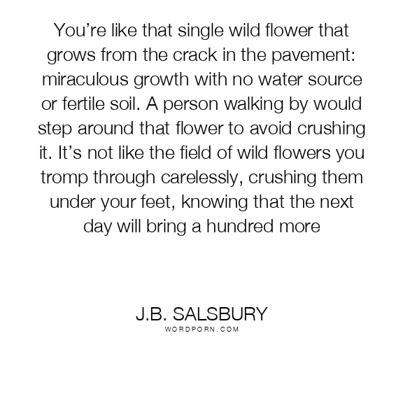 You’re like that single wild flower that grows from the crack in the pavement: miraculous growth with no water source or fertile soil. A person walking by would step around that flower to avoid crushing it. It’s not like the field of wild flowers you tromp through carelessly, crushing them under your feet, knowing that the next day will bring a hundred more