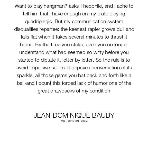 Want to play hangman? asks Theophile, and I ache to tell him that I have enough on my plate playing quadriplegic. But my communication system disqualifies repartee: the keenest rapier grows dull and falls flat when it takes several minutes to thrust it home. By the time you strike, even you no longer understand what had seemed so witty before you started to dictate it, letter by letter. So the rule is to avoid impulsive sallies. It deprives conversation of its sparkle, all those gems you bat back and forth like a ball-and I count this forced lack of humor one of the great drawbacks of my condition