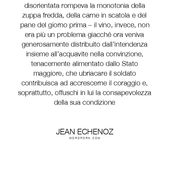 Imbattersi un bel giorno, per caso, in un’oca disorientata rompeva la monotonia della zuppa fredda, della carne in scatola e del pane del giorno prima – il vino, invece, non era più un problema giacché ora veniva generosamente distribuito dall’intendenza insieme all’acquavite nella convinzione, tenacemente alimentato dallo Stato maggiore, che ubriacare il soldato contribuisca ad accrescerne il coraggio e, soprattutto, offuschi in lui la consapevolezza della sua condizione