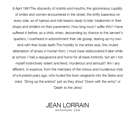 8 April 1891The obscenity of nostrils and mouths; the ignominious cupidity of smiles and women encountered in the street; the shifty baseness on every side, as of hyenas and wild beasts ready to bite: tradesmen in their shops and strollers on their pavements. How long must I suffer this? I have suffered it before, as a child, when, descending by chance to the servant's quarters, I overheard in astonishment their vile gossip, tearing up my own kind with their lovely teeth.This hostility to the entire race, this muted detestation of lynxes in human form, I must have rediscovered it later while at school. I had a repugnance and horror for all base instincts, but am I not myself instinctively violent and lewd, murderous and sensual? Am I any different, in essence, from the members of the riotous and murderous mob of a hundred years ago, who hurled the town sergeants into the Seine and cried, 'String up the aristos!' just as they shout 'Down with the army!' or 'Death to the Jews!