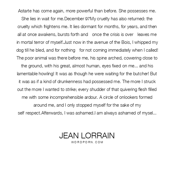 Astarte has come again, more powerful than before. She possesses me. She lies in wait for me.December 97My cruelty has also returned: the cruelty which frightens me. It lies dormant for months, for years, and then all at once awakens, bursts forth and - once the crisis is over - leaves me in mortal terror of myself.Just now in the avenue of the Bois, I whipped my dog till he bled, and for nothing - for not coming immediately when I called! The poor animal was there before me, his spine arched, cowering close to the ground, with his great, almost human, eyes fixed on me... and his lamentable howling! It was as though he were waiting for the butcher! But it was as if a kind of drunkenness had possessed me. The more I struck out the more I wanted to strike; every shudder of that quivering flesh filled me with some incomprehensible ardour. A circle of onlookers formed around me, and I only stopped myself for the sake of my self-respect.Afterwards, I was ashamed.I am always ashamed of myself nowadays. The pulse of life has always filled me with a peculiar rage to destroy. When I think of two beings in love, I experience an agonising sensation; by virtue of some bizarre backlash, there is something which smothers and oppresses me, and I suffocate, to the point of anguish.Whenever I wake up in the middle of the night to the muted hubbub of bumps and voices which suddenly become perceptible in the dormant city - all the cries of sexual excitement and sensuality which are the nocturnal respiration of cities - I feel weak. They rise up around me, submerging me in a sluggish flux of embraces and a tide of spasms. A crushing weight presses down on my chest; a cold sweat breaks out on my brow and my heart is heavy - so heavy that I have to get up, run bare-foot and breathless, to my window, and open both shutters, trying desperately to breathe. What an atrocious sensation it is! It is as if two arms of steel bear down upon my shoulders and a kind of hunger hollows out my stomach, tearing apart my whole being! A hunger to exterminate love.Oh, those nights! The long hours I have spent at my window, bent over the immobile trees of the square and the paving-stones of the deserted street, on watch in the silence of the city, starting at the least noise! The nights I have passed, my heart hammering in anguish, wretchedly and impatiently waiting for my torment to consent to leave me, and for my desire to fold up the heavy wings which beat inside the walls of my being like the wings of some great fluttering bird!Oh, my cruel and interminable nights of impotent rebellion against the rutting of Paris abed: those nights when I would have liked to embrace all the bodies, to suck in all the breaths and sup all the mouths... those nights which would find me, in the morning, prostrate on the carpet, scratching it still with inert and ineffectual fingers... fingers which never know anything but emptiness, whose nails are still taut with the passion of murder twenty-four hours after the crises... nails which I will one day end up plunging into the satined flesh of a neck, and...It is quite clear, you see, that I am possessed by a demon... a demon which doctors would treat with some bromide or with all-healing sal ammoniac! As if medicines could ever be imagined to be effective against such evil!