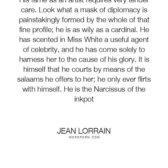 His fame as an artist requires very tender care. Look what a mask of diplomacy is painstakingly formed by the whole of that fine profile; he is as wily as a cardinal. He has scented in Miss White a useful agent of celebrity, and he has come solely to harness her to the cause of his glory. It is himself that he courts by means of the salaams he offers to her; he only ever flirts with himself. He is the Narcissus of the inkpot